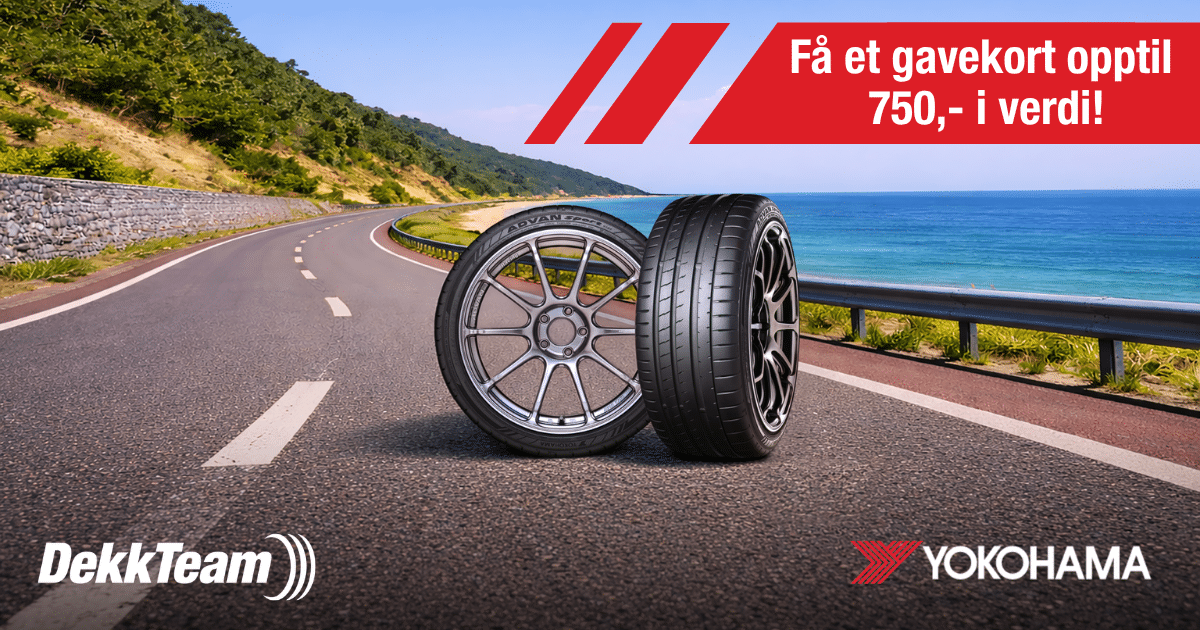 Fra 1. april til 31. mai 2026 kan du få et gavekort på opptil 750 kr når du kjøper fire Yokohama sommerdekk hos DekkTeam.